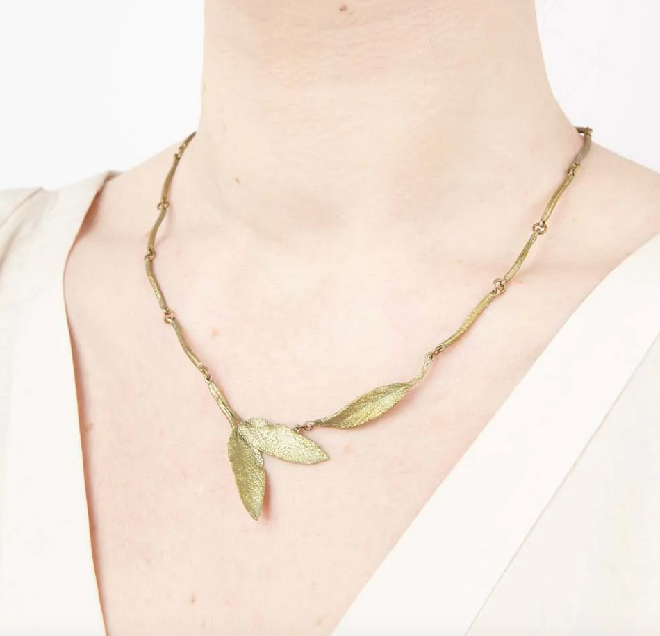 Michael Michaud Jewelry is a world-renowned collection of botanical jewelry. Our unique pieces capture the beauty and exquisite detail of nature using soft patinas on bronze accented with pearls, beads and semi-precious stones. Each piece is hand crafted in New York and cast from the actual plant, using a technique similar to lost-wax casting.Measures: Cast bronze with a hand patina finish. Accented with cast glass and a 24k gold finish.