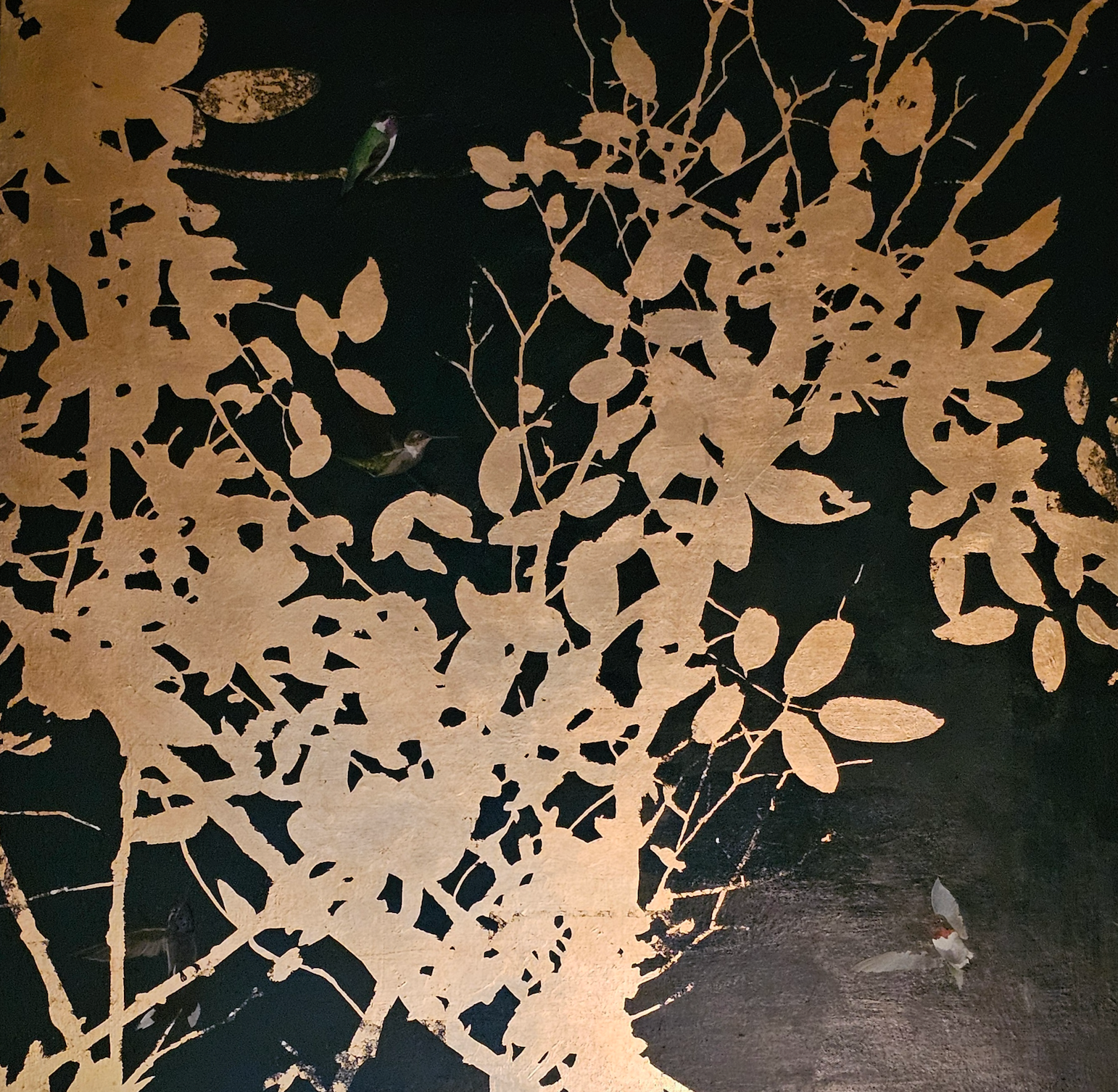 Nightscape hummingbird painting, by Gwen Wong. Her paintings are both representational and subjective in nature and represent a nostalgic nod to the past, present and future. A fourth generation Chinese American, Gwen has a BFA in Scientific Illustration and currently lives in Augusta, Georgia.