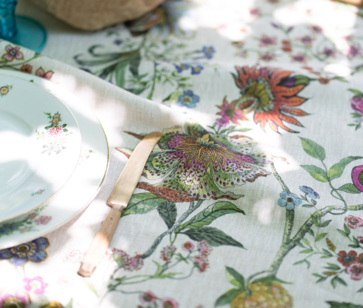 At the end of the 19th century in France, skilled craftsmen reproduced the beauty of nature on fabrics with realism, technique and elegance. Thus, inspired by the wonderful jacquard and printed fabrics of Lyon, the BILOBA tablecloth was born, printed on pure bleached linen, a mix of elegance in the design and refined retro taste. 100% Linen