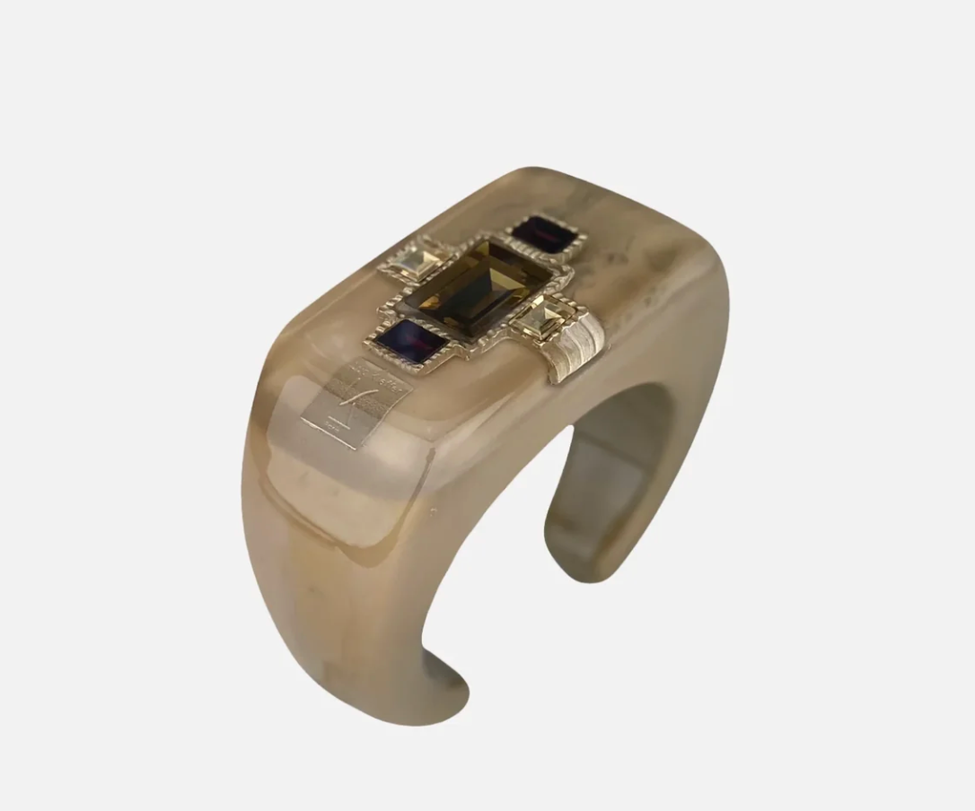 At its heart, Swarovski crystals shimmer beneath a layer of translucent resin — like fragments of light preserved in amber. The piece radiates an organic harmony, balancing elemental textures with Luc Kieffer’s signature modern artistry.