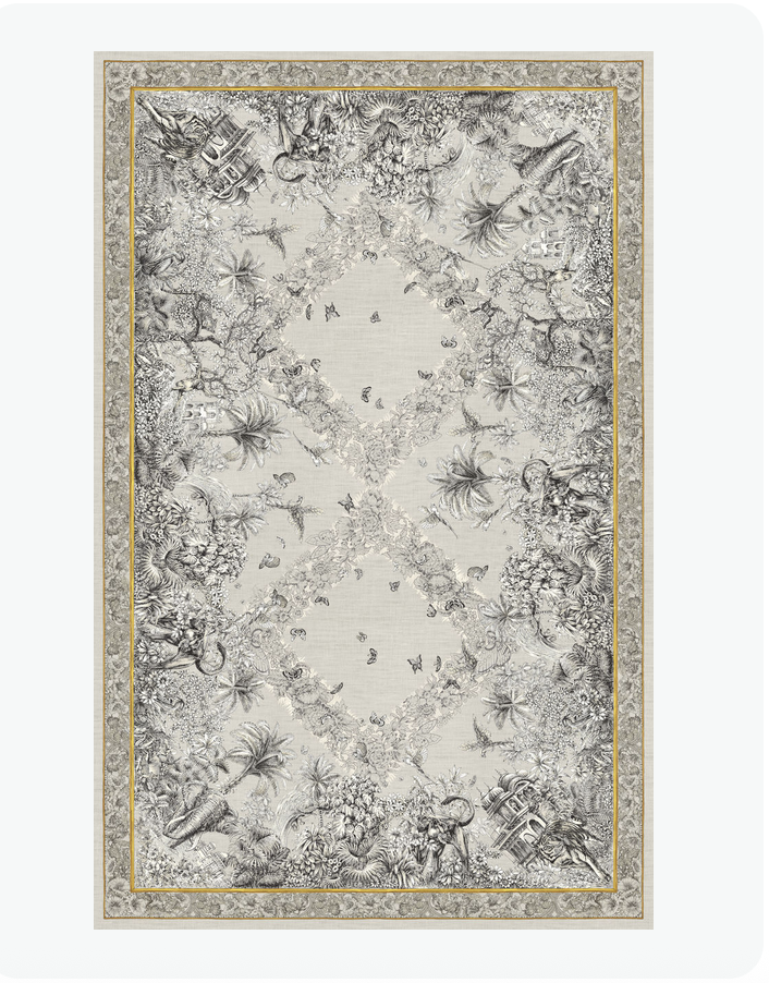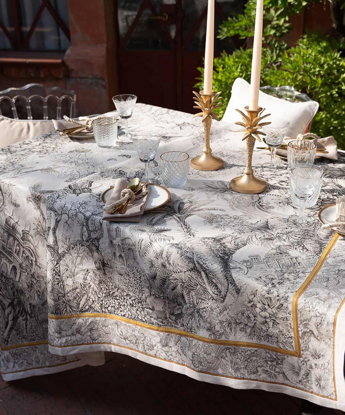 As a child I devoured Salgari's books, as a teenager I dreamed of saving princesses imprisoned in crumbling ruins in the jungle, as an adult I traveled to see remote places, as an old man I asked a great artist, my friend Thierry, to stage on a tablecloth my fantastic reality. The TANTRA tablecloth, in natural linen, reminds you to chase your fantasies. Your guests will be transported with you to a dimension where the mind is sovereign.