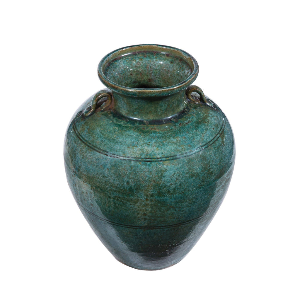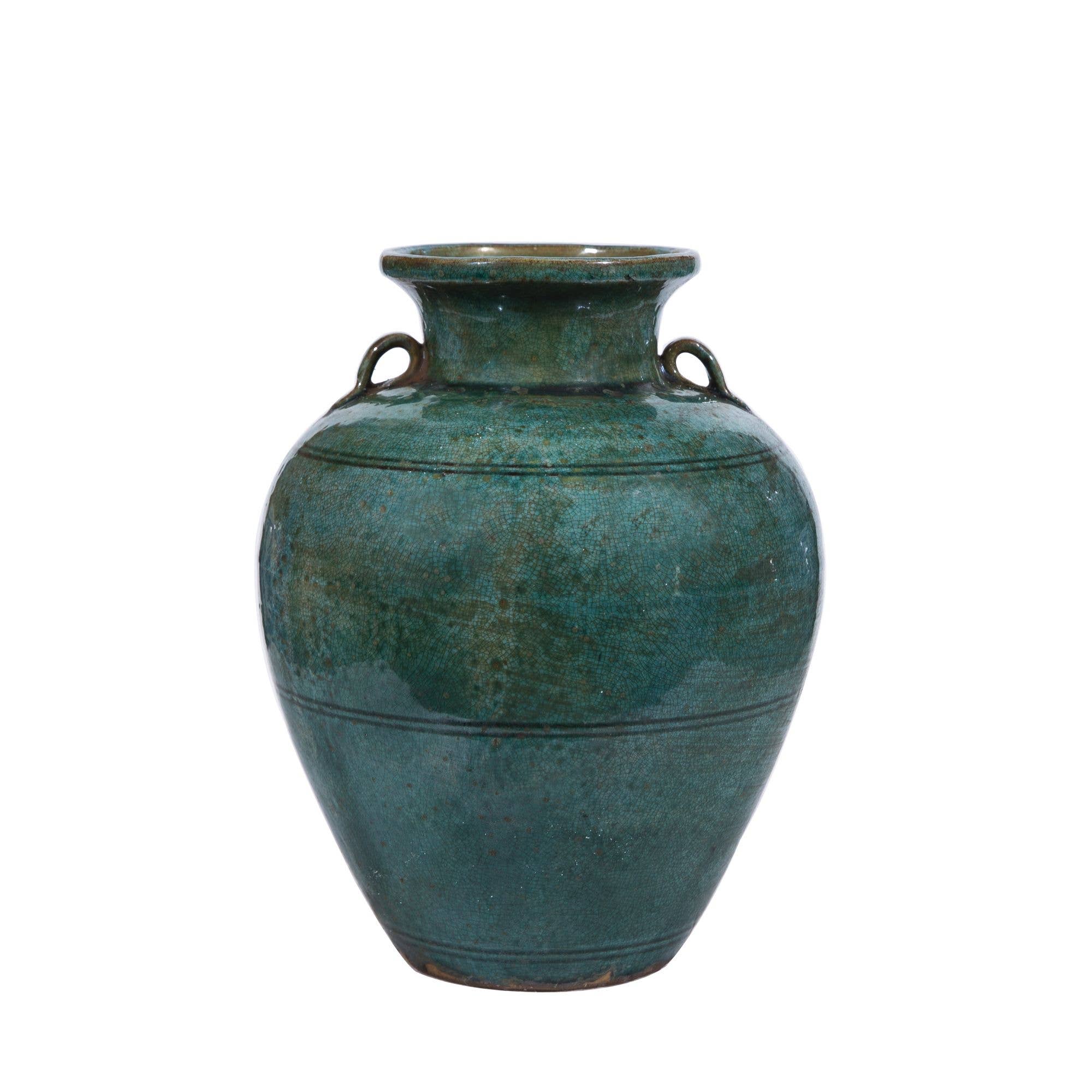 The Speckled Green Double Ear Greek Jar is a unique and beautiful piece for your home. It is hand made and hand painted from highfire porcelain, making it a great choice for decoration. This antique reproduction jar features a lovely speckled green color and has two handles, or "ears," on the sides. Perfect for adding an elegant touch to any room.