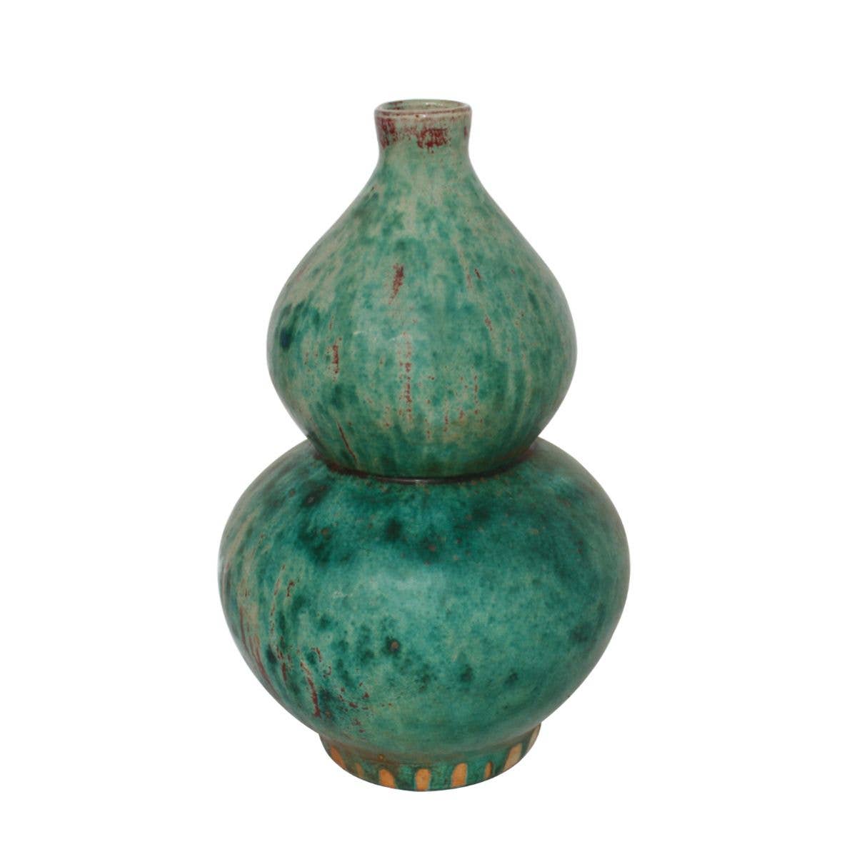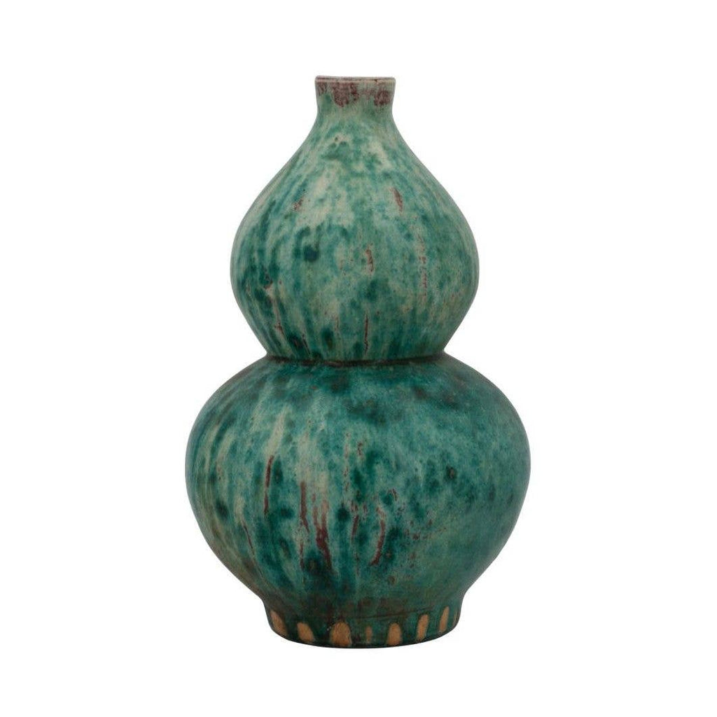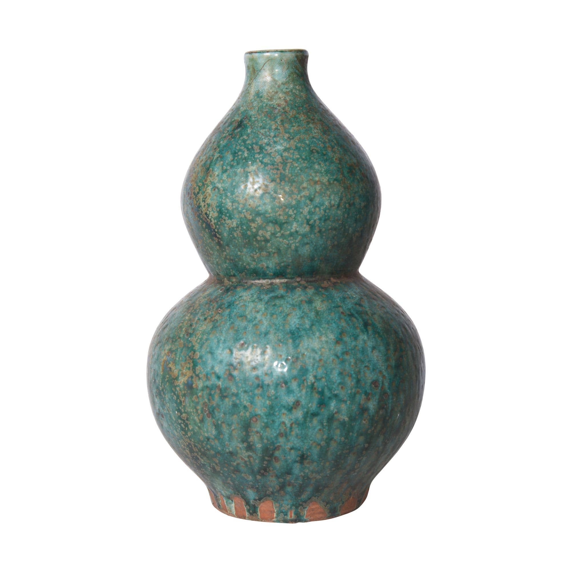 The Speckled Green Gourd Vase is a unique, hand-made porcelain piece for your decorative needs. This vase is crafted and painted by hand, showcasing highfire porcelain for durability and beauty. It is an antique reproduction, giving it a timeless and classic look. Perfect for adding a special touch to any room.