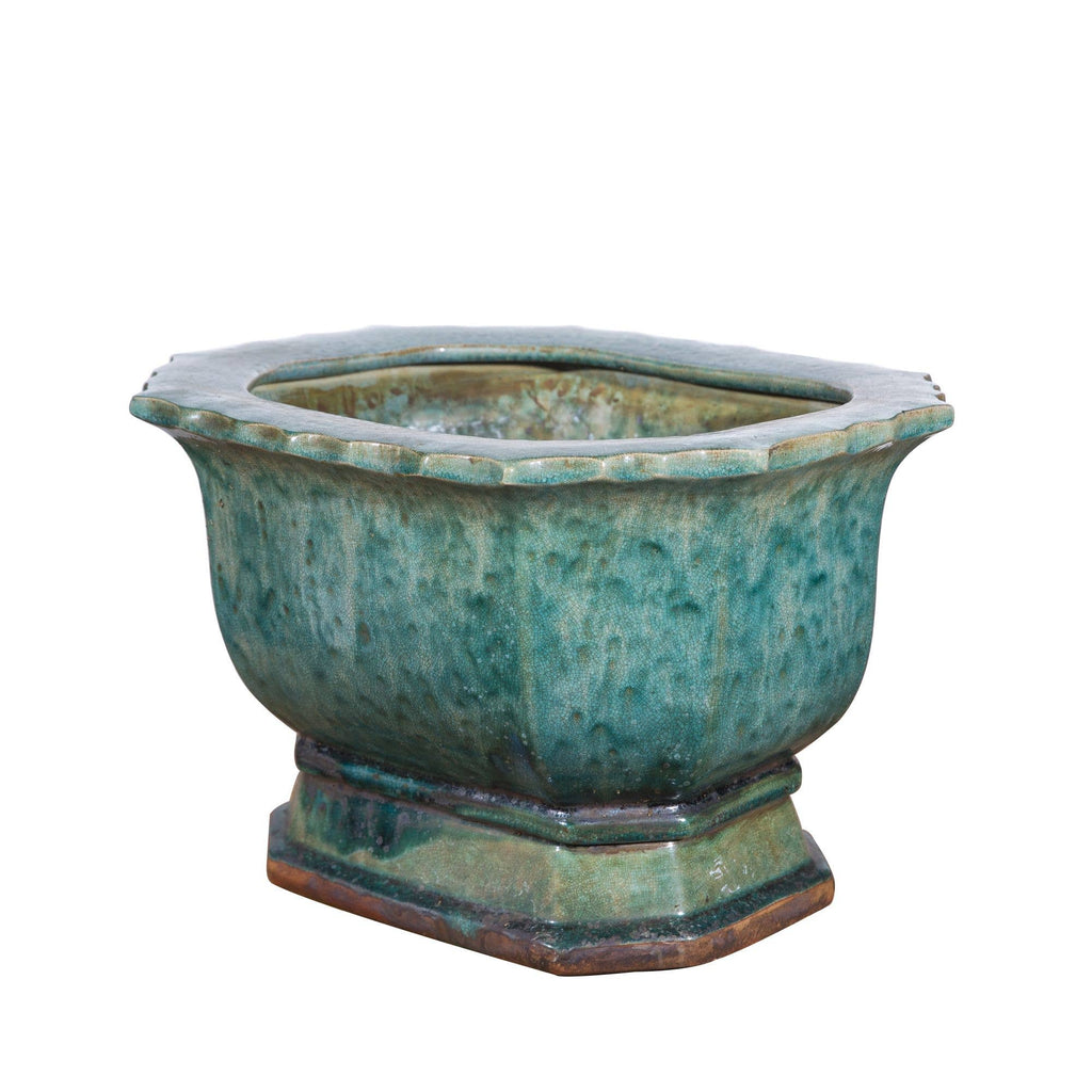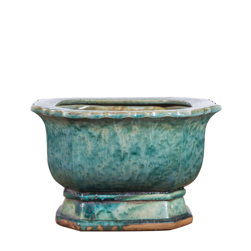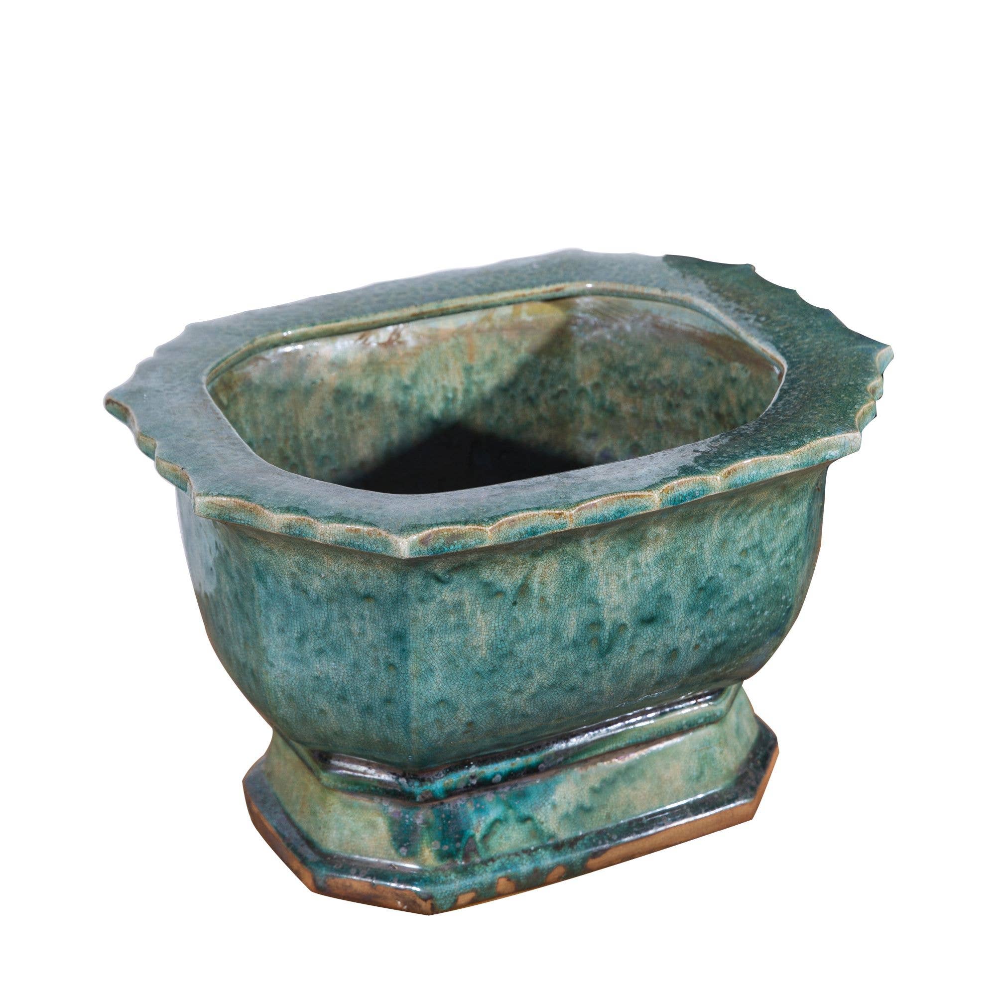 The Speckled Green Rectangular Planter is a unique, hand-made porcelain piece perfect for your decorative needs. Each planter is hand-crafted, hand-painted, and high-fired, ensuring high quality and durability. The antique reproduction design gives it a classic and timeless look. This beautiful planter is ideal for adding a touch of elegance to any space. Size: 15in x 9 in x 10 in (W x D x H)