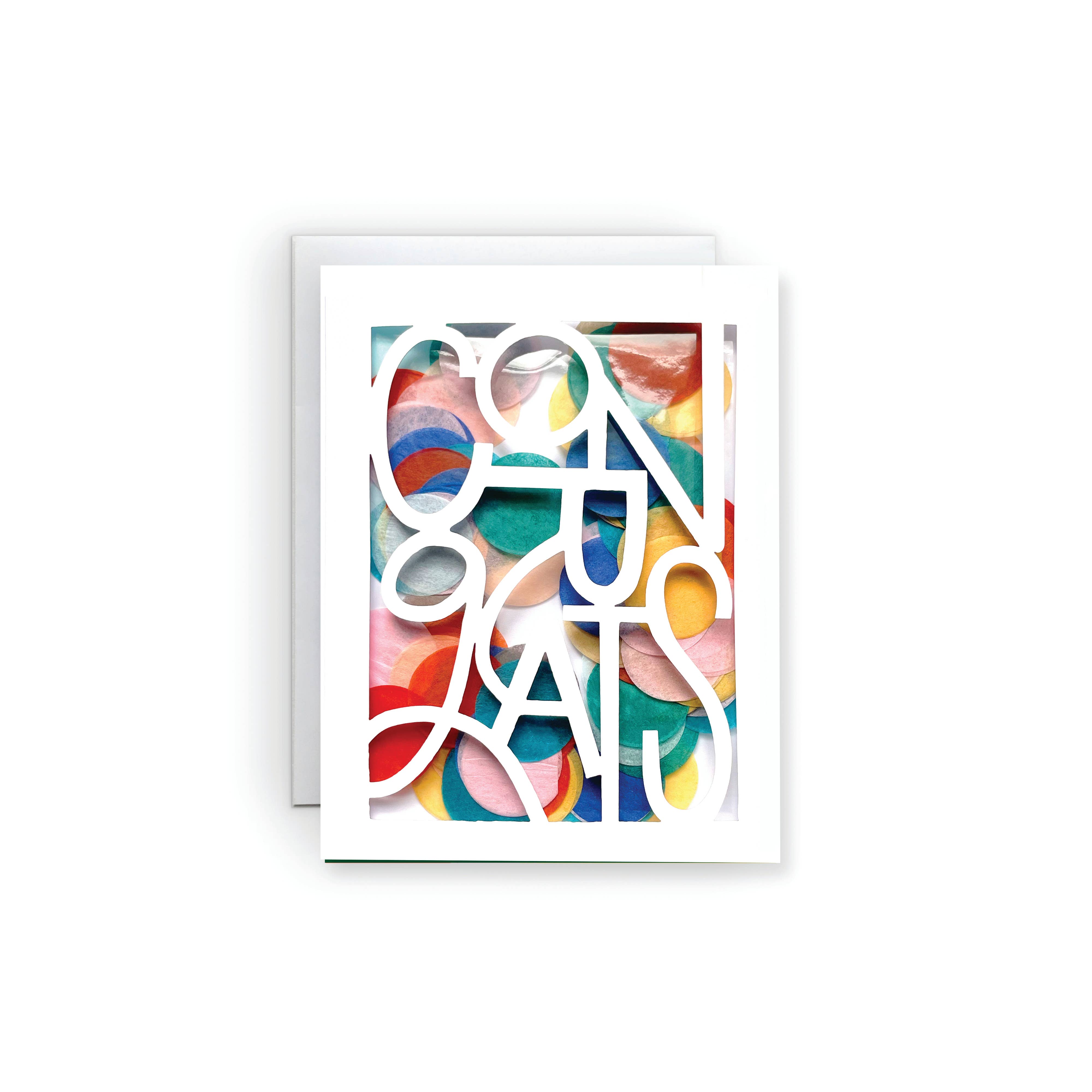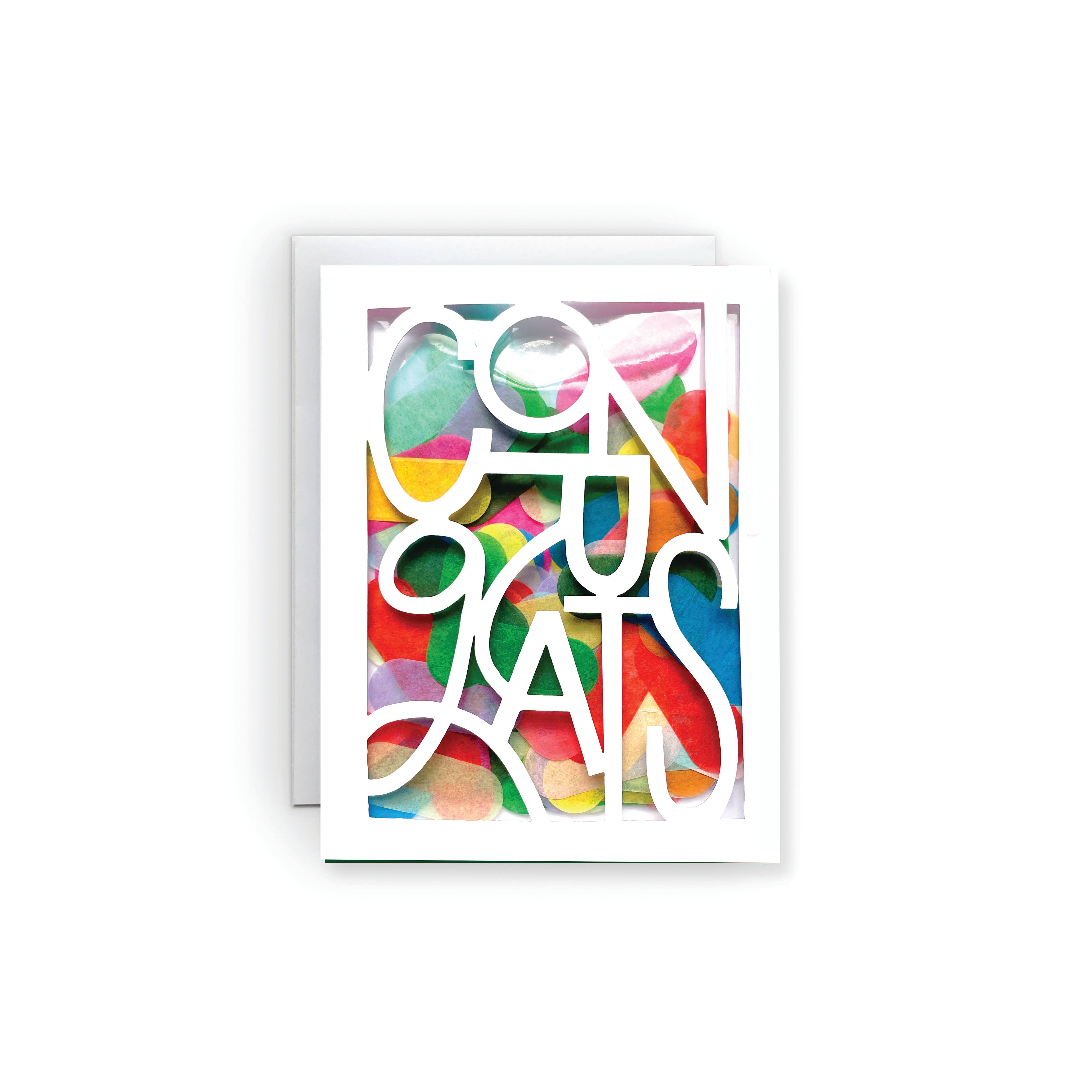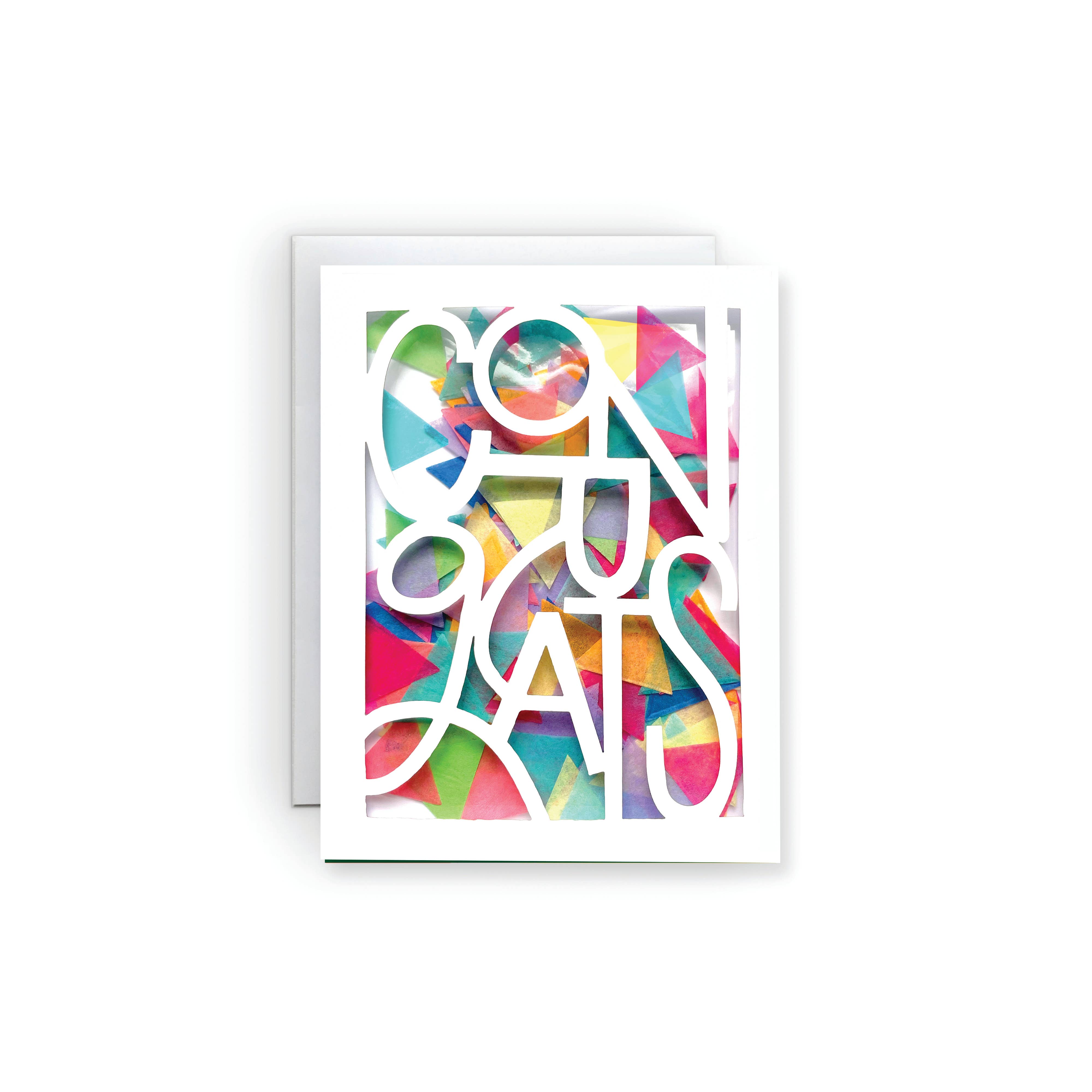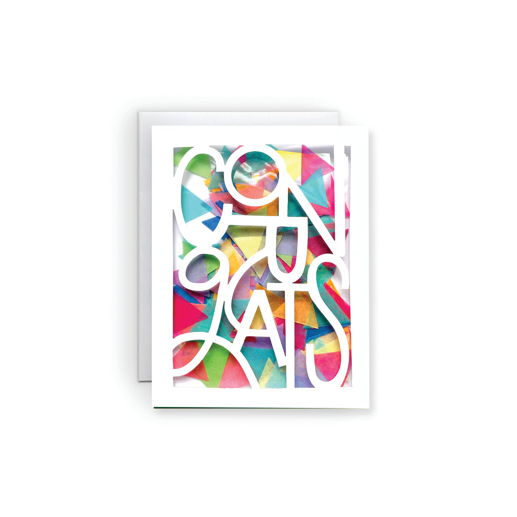 PAPER | 270 gsm ultra white smooth cover stock, die cut sentiment, cello-encased confetti.