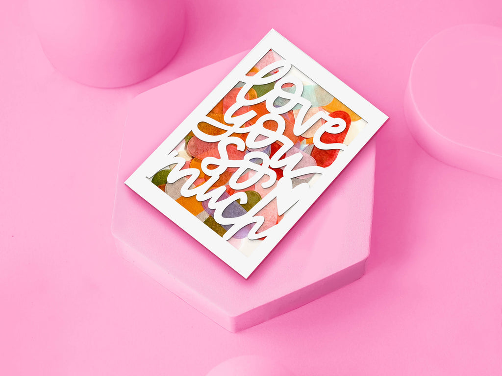 PAPER | 270 gsm ultra white smooth cover stock, die cut sentiment, cello-encased confetti.