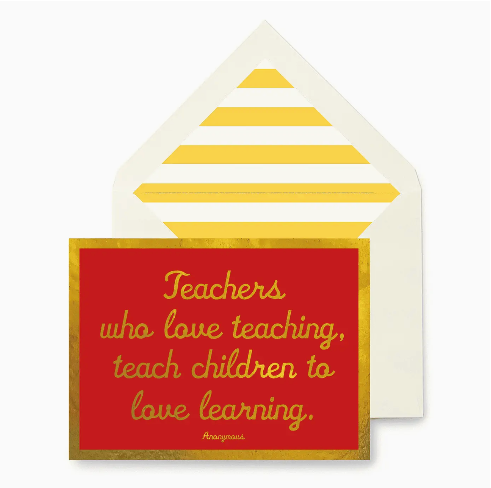 Whether she’s the one who taught your child to read or the friend who finally landed that plum teaching job, tell her she has an oh so important impact on the world with our glittering gold greeting card with a bright yellow striped matching envelope. The inside of the apple red card is blank for your own words of gratitude or admiration.  A+ Well done you. Available as a blank single card.