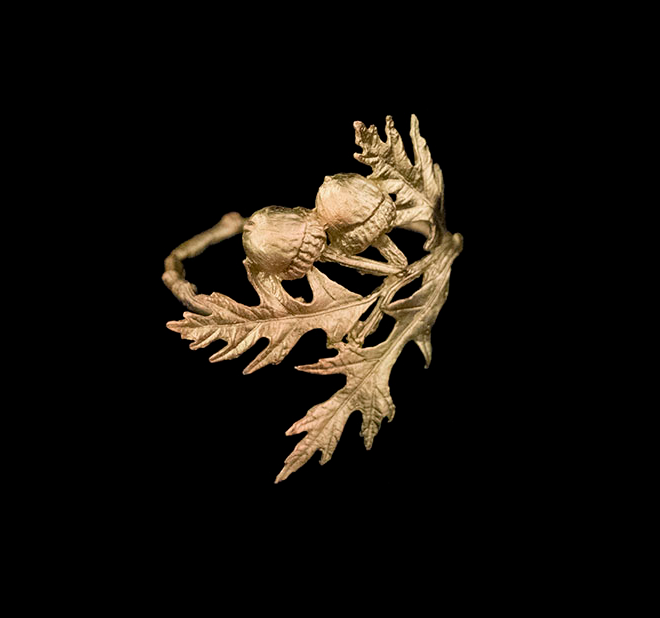 Four Acorn Napkin Rings from the Michael Michaud Collection. Inspired from Nature to your Tabletop. In antique brass.