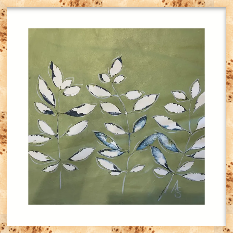 Alli Stark, a Texas based artist , is known for her "Stem Series" which she calls "abstract botanicals". One of a kind pieces using stems and leaves are placed on paper, layered with paint , and removed, creating a striking negative impression .