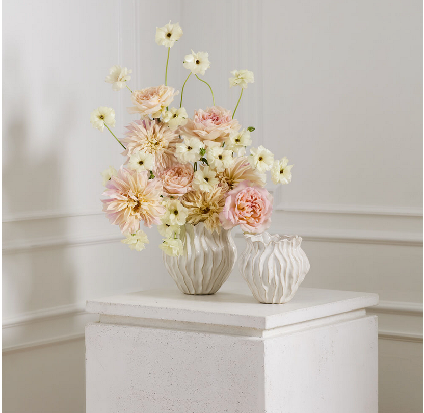 Organic curves give the ceramic Brynn Collection unique dimensional interest for florals to stand out. Featuring a flared opening, narrow base, & artful wavy lineation, these small-scale sculptural vessels offer a stunning neutral place for florals to shine as part of home decor, wedding, or event displays.Organic curves give the ceramic Brynn Collection unique dimensional interest for florals to stand out. Featuring a flared opening, narrow base, & artful wavy lineation, these small-scale sculptural vessels offer a stunning neutral place for florals to shine as part of home decor, wedding, or event displays.