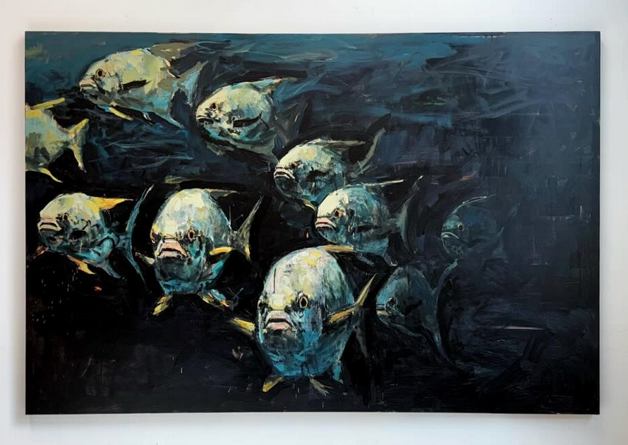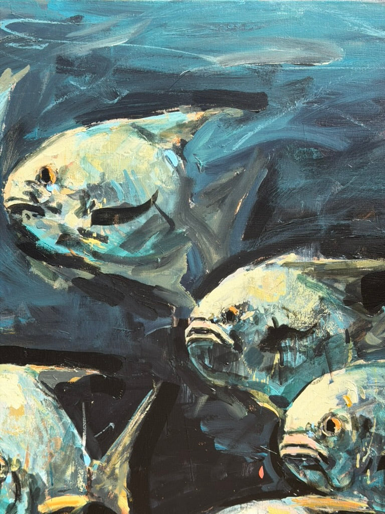 Stunning painting of school of permit by Alabama artist Madison Faille. Acrylic on canvas .46" x 72" x 1"