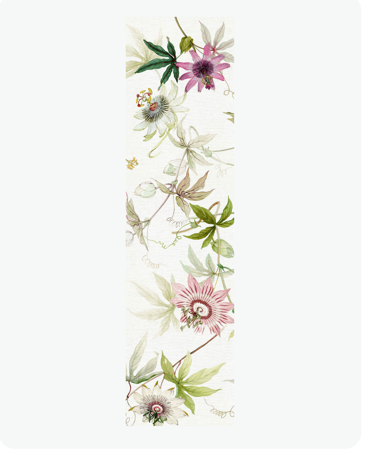 Passion fruit details are drawn on the pure bleached linen of the Granadilla table runner, an elegant piece to decorate your living room.